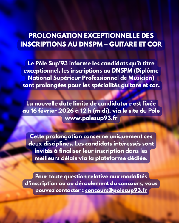 Saisissez vos mots-clés accès étudiants profs oasis recherche instagram facebook le pôle sup’93Actualités présentation projet pédagogique ÉQUIPES LES PARTENAIRES Nous soutenir RECRUTEMENTS ENTRER ET SE FORMERDNSPM DIPLÔME D'ÉTAT - ARTICULÉ AVEC LE DNSPM DIPLÔME D'ÉTAT - FORMATION PROFESSIONNELLE VAE Étudiants / DiplômésParoles de diplômé·es Réussite des étudiants Écouter, Voir & LireÉvénements Vidéos ÉCOUTER Travail de recherche pédagogique Recherche infos pratiquesLES SITES Vie pratique étudiante / stagiaire Ressources handicap Dépôt d'annonces NOUS CONTACTER ERASMUS+ Actualités PROLONGATION EXCEPTIONNELLE DES INSCRIPTIONS AU DNSPM – GUITARE ET COR 11/02/2026 Le Pôle Sup’93 informe les candidats qu’à titre exceptionnel, les inscriptions au DNSPM (Diplôme National Supérieur Professionnel de Musicien) sont prolongées pour les spécialités guitare et cor. La... NEWSLETTER POLE SUP'93 : ACTUALITÉS FÉVRIER 2026 11/02/2026 Notre newsletter est en ligne >>>> CLIQUEZ ICI Dans cette édition du mois de février 2026 de la newsletter du Pôle Sup'93, découvrez.... ► À venir en février : « NOUVELLES PISTES » PAR... Retour en images : Création au féminin – une soirée pour révéler et comprendre 16/01/2026 Le jeudi 8 janvier 2026, le Pôle Sup’93 a proposé, à l’auditorium du CRR 93 Jack Ralite, site d’Aubervilliers, une soirée exceptionnelle consacrée à la création musicale au féminin. Cet événement a... PROGRAMMATION SAISON 25-26 DU PÔLE SUP'93 EST DISPONIBLE ! 02/10/2025 Nous sommes ravis de vous présenter la programmation de la saison 2025-2026 du Pôle Sup'93. Ce livret vous dévoile les dates et horaires de nos masterclasses, sessions de musique d’ensemble,... Retour en images : Masterclasse de saxhorn avec Vianney Desplantes 09/02/2026 Le jeudi 5 février 2026, le Pôle Sup’93 a accueilli Vianney Desplantes à l’auditorium du CRR 93 Jack Ralite, site d’Aubervilliers, à l’occasion d’une masterclasse de saxhorn ouverte aux étudiants et... Retour en images : Participation des étudiant·es/stagiaires du Pôle à la 3ᵉ édition de la Biennale de piano collectif, organisée par le Conservatoire de musique et de danse de Saint-Denis. 09/02/2026 Du 29 janvier au 1er février 2026, la ville de Saint-Denis a accueilli la 3ᵉ édition de la Biennale de piano collectif, un événement mettant à l’honneur le collectif dans la musique et la pédagogie.... voir toutes les actualités "Nouvelles pistes" par Clément Dazin, en partenariat avec l’Académie Fratellini Petit Chapiteau de l'Académie Fratellini 14/02/2026 - 18:30 Cirque Masterclasse jazz avec Henri Texier Auditorium du CRR 93, site de La Courneuve 17/02/2026 - 13:00 Masterclass CARTE BLANCHE #3 ORGANISÉE PAR LE BDE DU PÔLE SUP'93 Auditorium du CRR93, site d'Aubervilliers 18/02/2026 - 19:30 Concert des étudiant·es