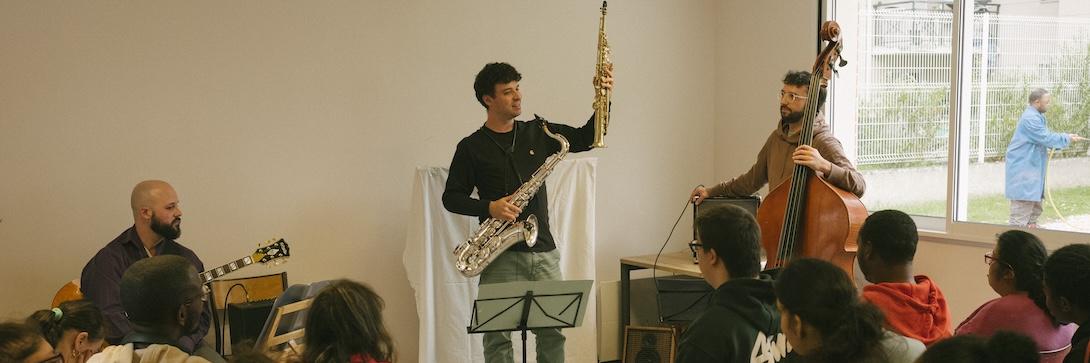 Parmi les lauréats de cette édition figure le trio Dawn Escapades, composé de Volodia (guitare), Antonin (contrebasse) et Benoît (saxophone). Tous trois diplômés du DNSPM du Pôle Sup’93, ils ont donné un concert jazz-pop au foyer de vie Cap Avenir de Dugny, établissement accueillant des adultes en situation de handicap psychique.
