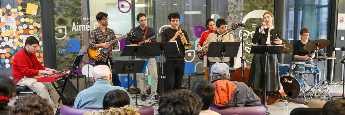 Les étudiants et étudiantes en jazz et musiques improvisées du Pôle Sup’93 ont fait vibrer la médiathèque Aimé Césaire de La Courneuve lors d’un après-midi musical.