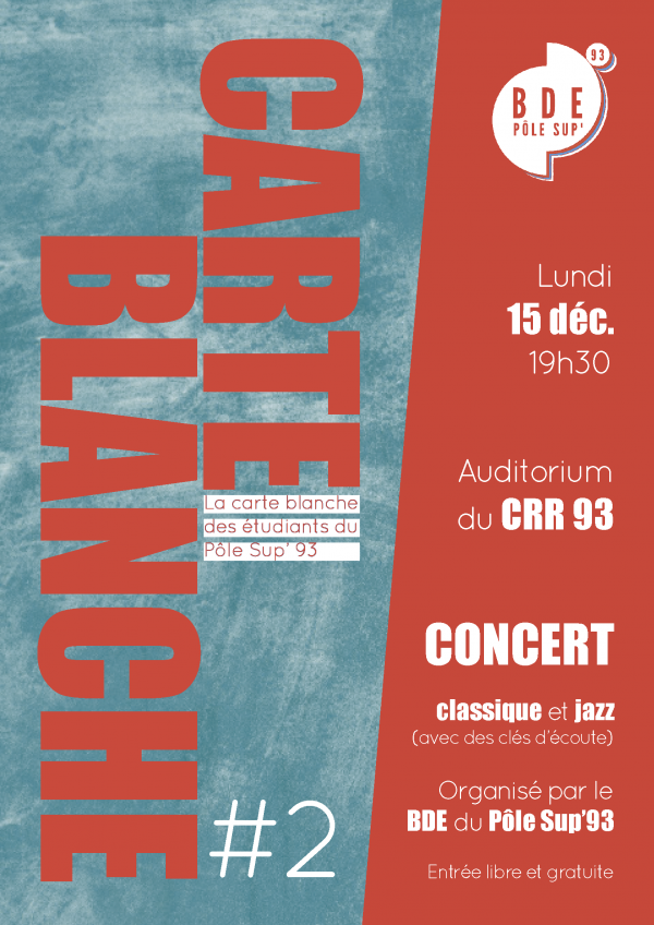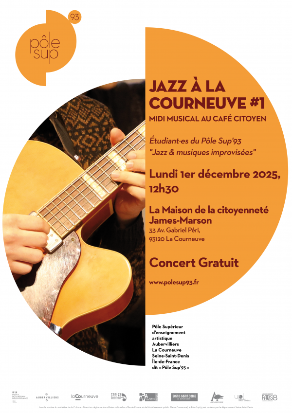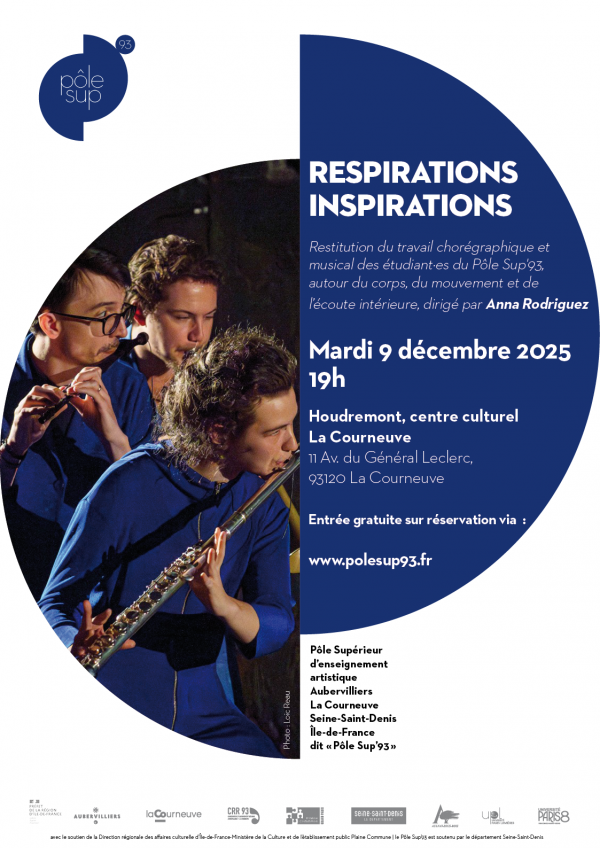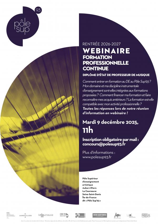Saisissez vos mots-clés accès étudiants profs oasis recherche instagram facebook le pôle sup’93Actualités présentation projet pédagogique ÉQUIPES LES PARTENAIRES Nous soutenir RECRUTEMENTS ENTRER ET SE FORMERDNSPM DIPLÔME D'ÉTAT - ARTICULÉ AVEC LE DNSPM DIPLÔME D'ÉTAT - FORMATION PROFESSIONNELLE VAE Étudiants / DiplômésParoles de diplômé·es Réussite des étudiants Écouter, Voir & LireÉvénements Vidéos ÉCOUTER Travail de recherche pédagogique Recherche infos pratiquesLES SITES Vie pratique étudiante / stagiaire Ressources handicap Dépôt d'annonces NOUS CONTACTER ERASMUS+ Mois -Moisjanfévmaravrmaijuinjuilaoûsepoctnovdéc Année -Année202120222023202420252026 Jazz à La Courneuve #1 : Midi musical au café citoyen Maison de la citoyenneté de La Courneuve 01/12/2025 - 12:30 JAZZ / MUSIQUES DU MONDE / MUSIQUES ACTUELLES IMPROVISÉES Masterclasse Flûte Traversière avec Gaby Pas-Van Riet Auditorium du CRR93, site d'Aubervilliers 04/12/2025 - 10:00 Masterclass Concert de l’Orchestre d’Harmonie du Conservatoire royal de Bruxelles avec la participation des étudiant·es du Pôle Sup’93 NOVUM 05/12/2025 - 20:00 musique d'ensemble Masterclasse Piano accompagnement avec Olivier Reboul Auditorium du CRR 93 Jack Ralite, site d'Aubervilliers 08/12/2025 - 10:00 Masterclass Réunion d'information en webinaire | formation professionnelle continue au Diplôme d'État de professeur de musique - Inscriptions 2026-2027. 09/12/2025 - 11:00 Webinaire Respirations-Inspirations : atelier son-corps Houdremont, centre culturel La Courneuve 09/12/2025 - 19:00 projet pluridisciplinaire CARTE BLANCHE #2 ORGANISÉE PAR LE BDE DU PÔLE SUP'93 Auditorium du CRR93, site d'Aubervilliers 15/12/2025 - 19:30 Concert des étudiant·es Masterclasse contrebasse avec Charlotte Testu Auditorium du CRR93, site d'Aubervilliers 18/12/2025 - 13:30 Masterclass