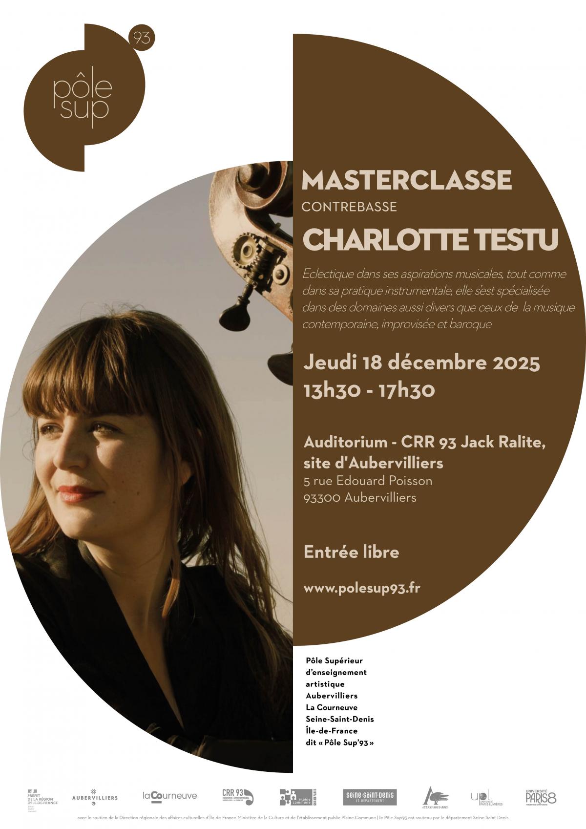 Le Pôle Sup'93 a le plaisir d'accueillir Charlotte Testu pour une masterclasse de contrebasse exceptionnelle. Venez découvrir son expertise et explorer de nouvelles techniques de jeu en compagnie des étudiantes et étudiants du Pôle Sup'93, le jeudi 18 décembre 2025, de 13h30 à 17h30, à l'auditorium du CRR 93 Jack Ralite, site d’Aubervilliers