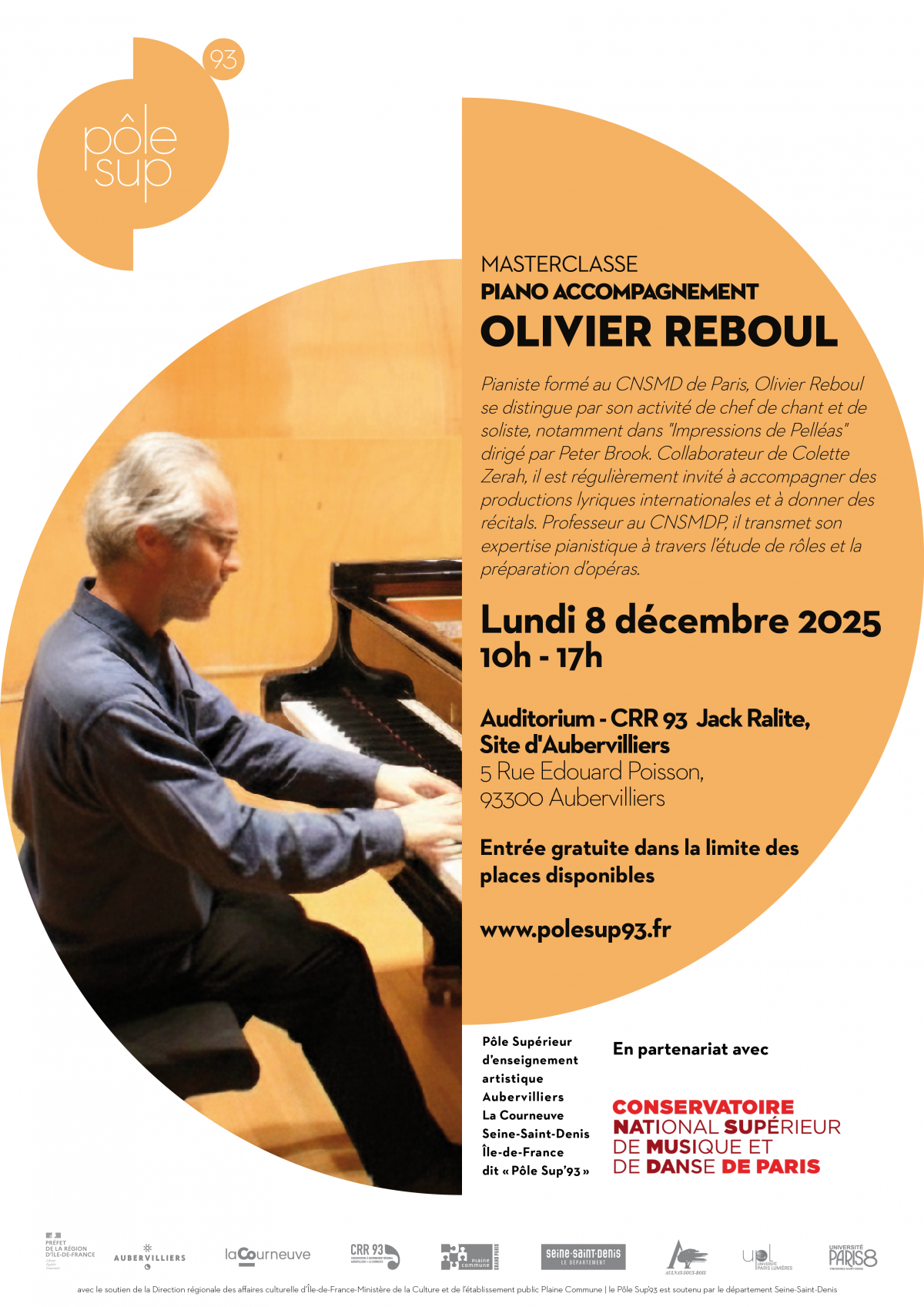 Le Pôle Sup'93 a le plaisir d’accueillir Olivier Reboul, pianiste, chef de chant et pédagogue au Conservatoire national supérieur de musique et de danse de Paris, pour une masterclasse de piano accompagnement.