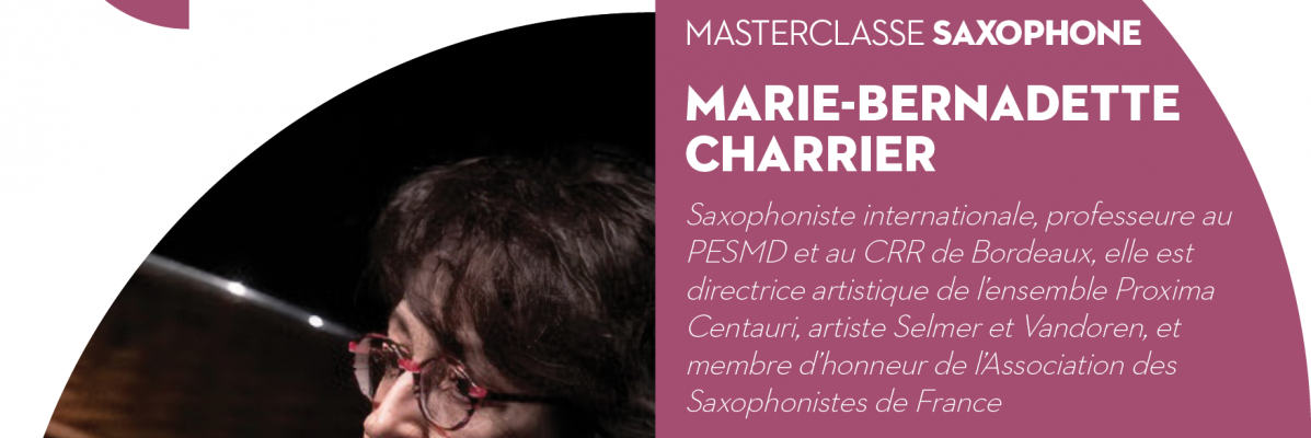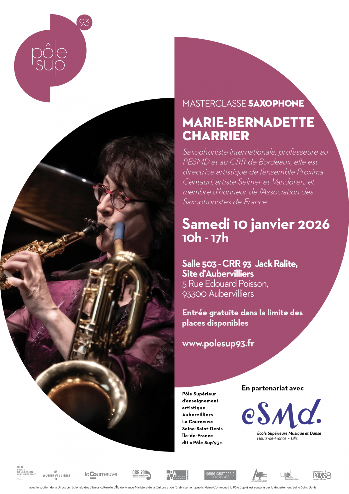 Le Pôle Sup’93 a le plaisir d’accueillir Marie-Bernadette Charrier, saxophoniste internationale et figure incontournable de la création contemporaine, pour une masterclasse exceptionnelle. Professeure au PESMD et au CRR de Bordeaux, directrice artistique de l’ensemble Proxima Centauri, elle est également artiste Selmer et Vandoren, et membre d’honneur de l’Association des Saxophonistes de France.